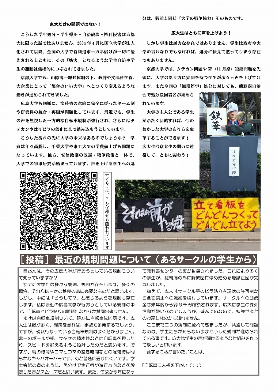 情報開示請求の回答が! 自治会関係の法人文書なし!? 7月9日発行のビラです。 大学が保有している法人文書(大学組織としての意思決定に関して作成・取得された、電子データも含む「文書」のこと)を開示させる情報開示請求。 学生自治会に関する情報開示請求を行ったところ、この3年間、入学式で配布された学生自治会への誹謗中傷ビラだけが法人文書として開示され、他に関係するものはない、という回答。 そうするとまずもって、学生自治会を誹謗中傷した上記ビラの作成や、そのビラを入学式で配布することを決定した過程等に関わる事柄について、法人文書はない=大学の意思決定に文書が介在していない、ということになります。おおよそ考え難く、本当にそうだとしたら、そうとうにずさんな体制で、毎年学生自治会を入学式から名指しで誹謗中傷してきたことになります。 それに今年行われてきた、パワハラとしか受け止められない、学生生活支援グループの連日の学生自治会に対する執拗な攻撃についても、法人文書(メールなども!?)がなかったということから、組織決定として行われてきたのか、職員個々人のハラスメントだったのかも不明瞭ということになってしまいます。 学生生活支援グループリーダーの田中恵一職員(自分から転んで傷害罪をでっち上げ、学生自治会メンバーを警察に売り渡した人物)は、かつて法人文書について学内で講演を行っており(2016年「あなたにとって文書とはなんですか」 http://ir.lib.hiroshima-u.ac.jp/ja/list/HU_journals/AA12030682/--/19/item/42989)、学生自治会への対応についてであろうが、文書管理がなされていなかったなどありえない、優秀な文書管理のスペシャリストだったはずです。にもかかわらず、学生自治会についてのまともな法人文書が一切ない。だとすると広島大学では、昨年あたりから国政の大問題として取り上げられるようになってきた「公文書隠し」が、巧妙に行われてきたということになるでしょうか? そうでないなら、これまでの学生自治会への対応の一切は、書類もきちんと作成しないで、恣意的に広島大学の名をかたって行われてきた、ということになるかもしれません。 まだまだ情報開示請求の文言が甘かった可能性もあるので、私たちとしては、引き続き様々な学内情報について、情報開示請求を続けていきたいと思っています。