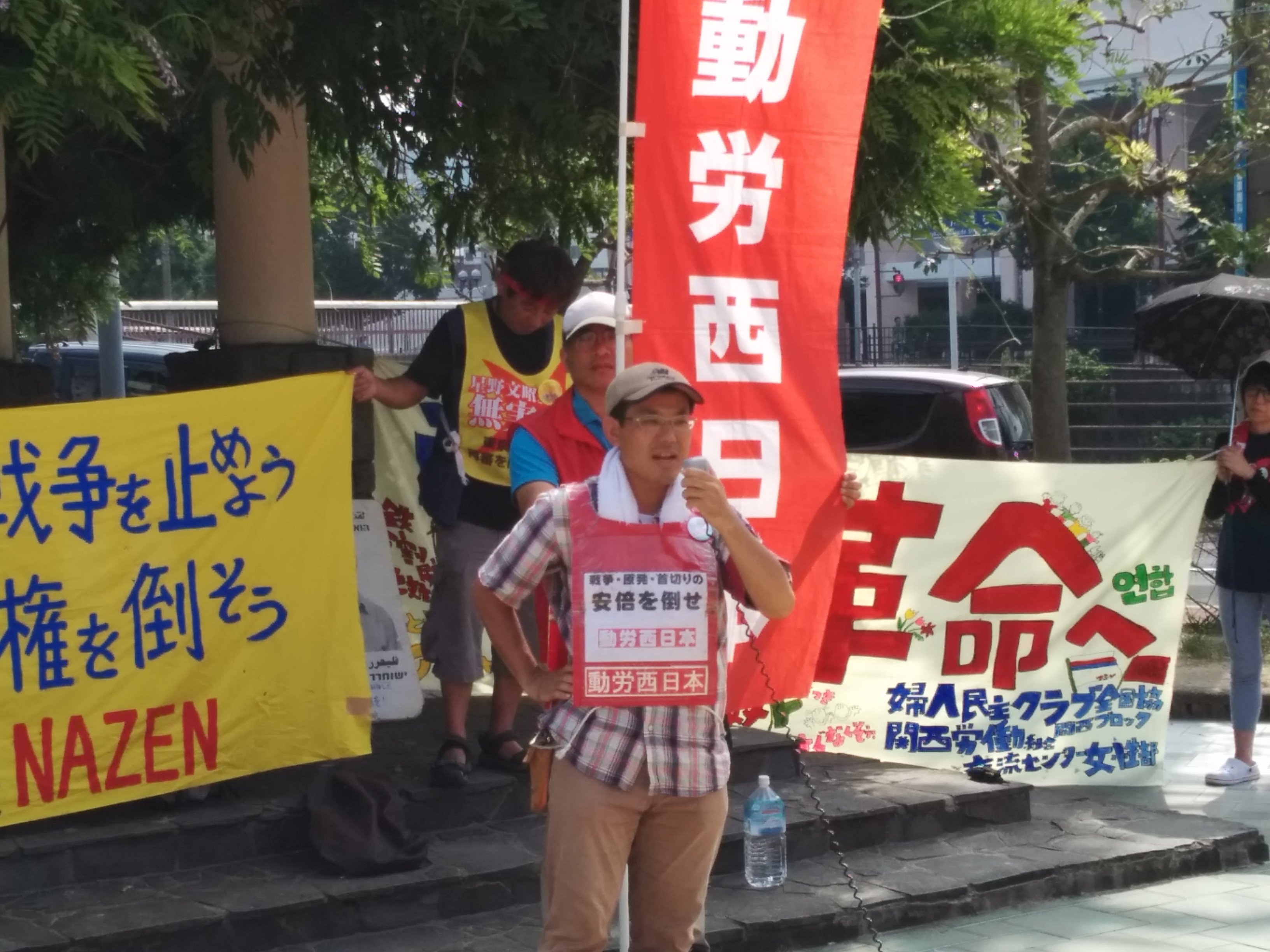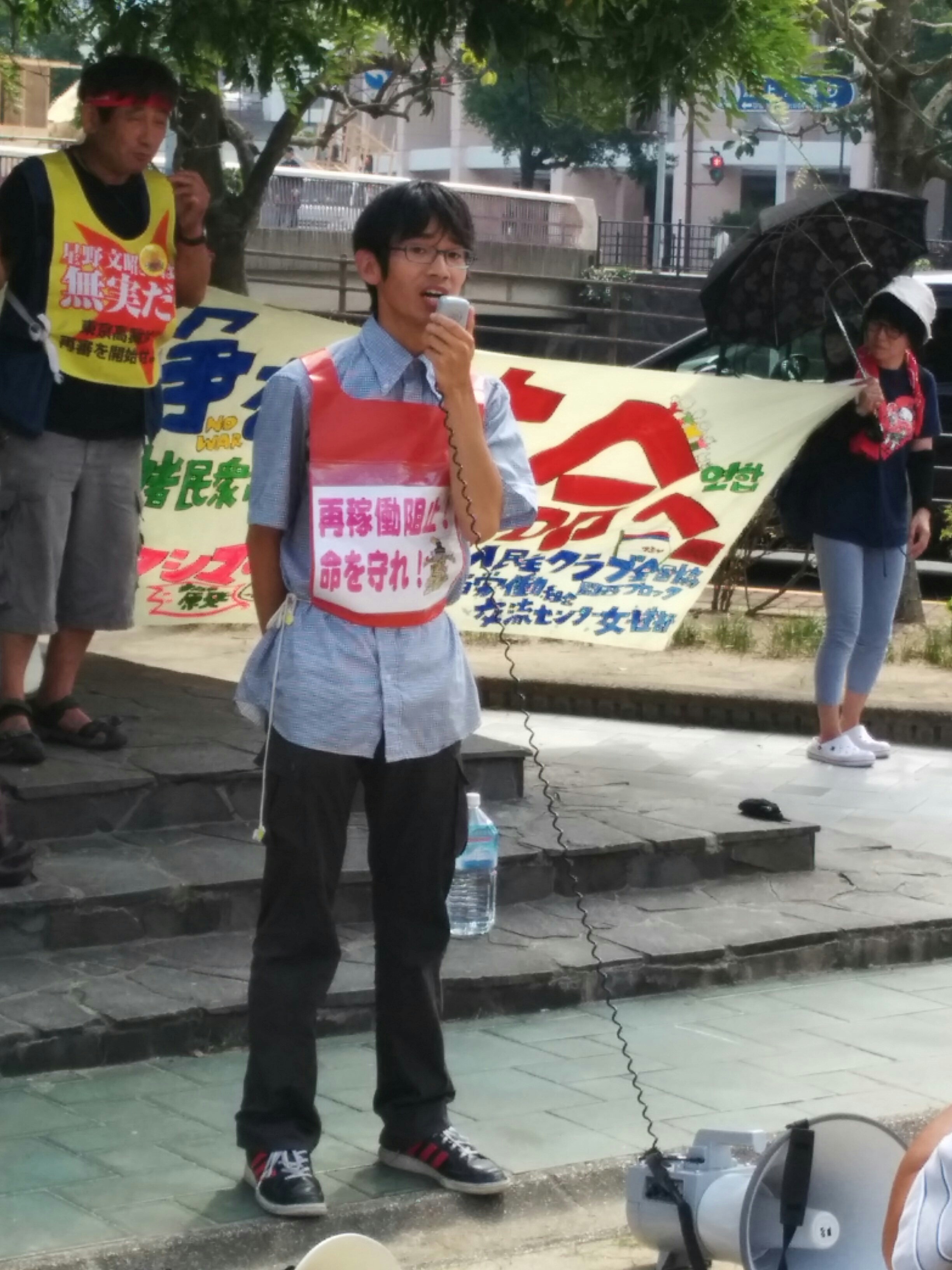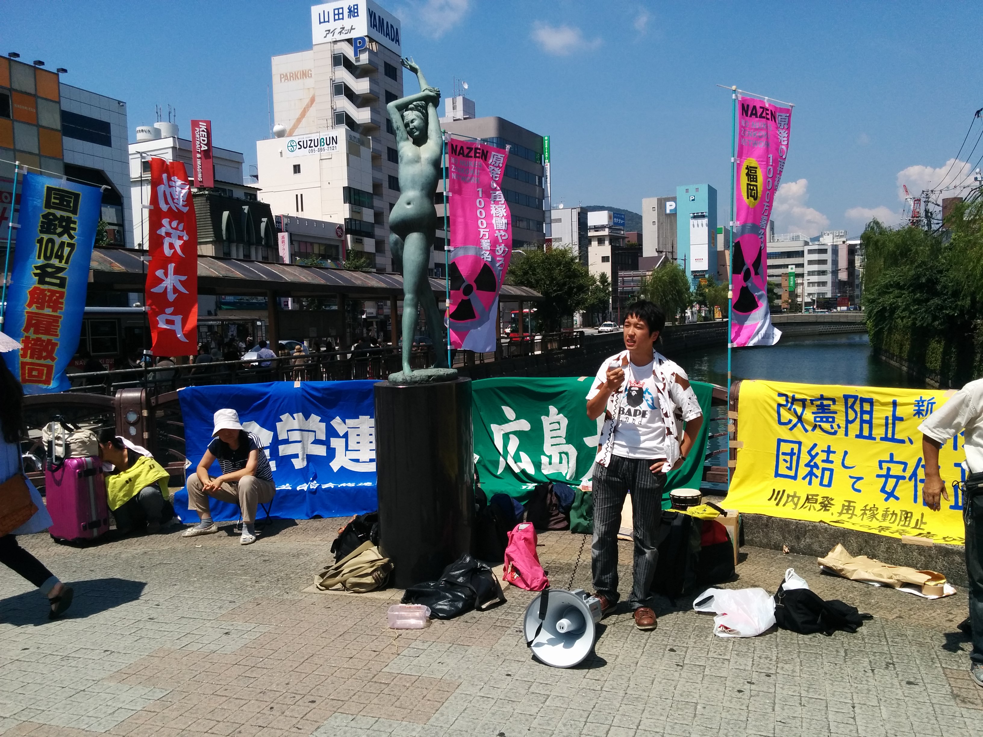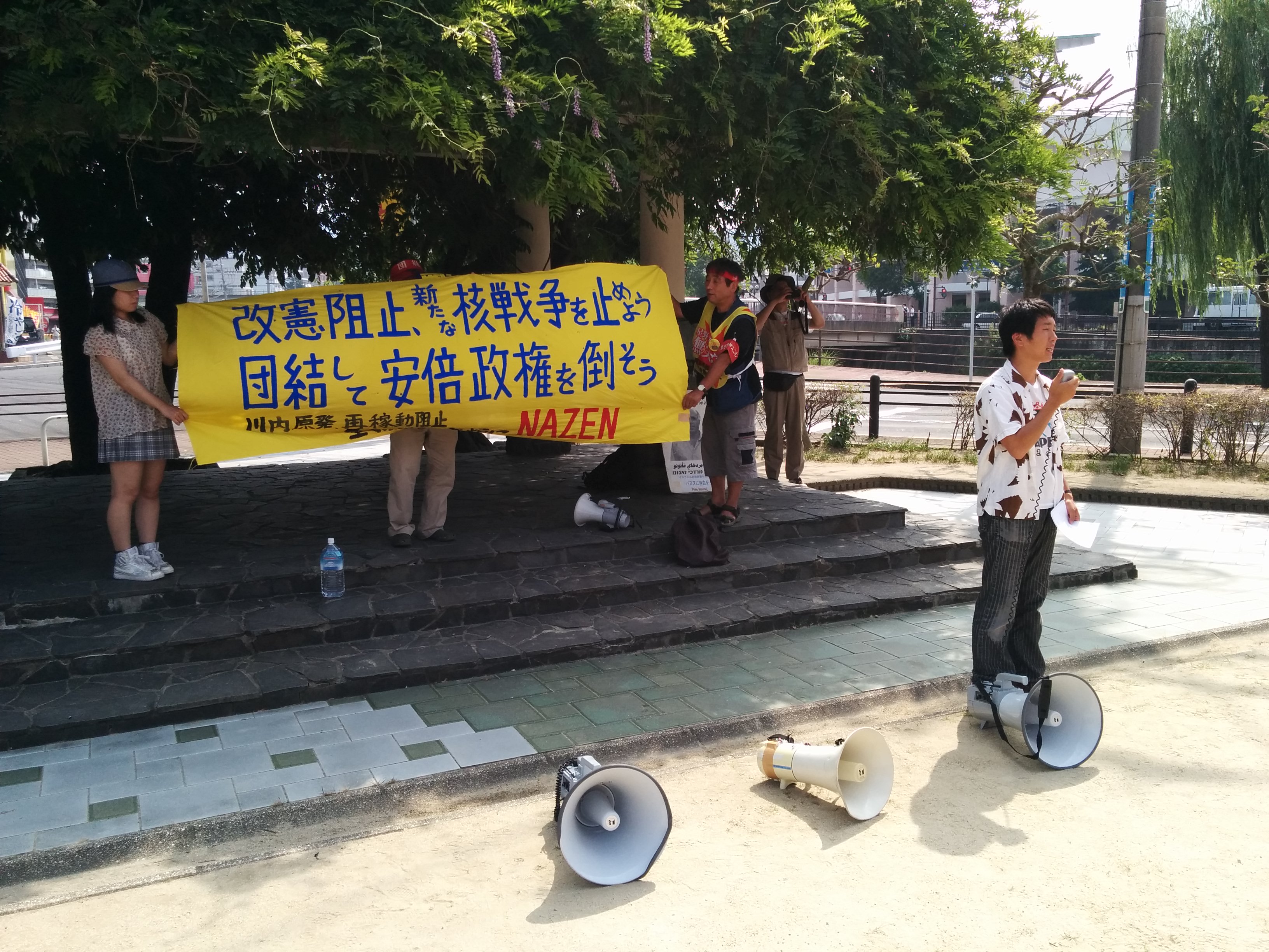 広島大学学生自治会は、7月2日昼休み、スペイン広場にて「7・2広大キャンパス集会」を大成功で打ち抜き、「広大を反戦のとりで」にする決定的一歩を踏み出しました! まずはじめに学生自治会の森田寛隆君が、「安倍政権は打倒寸前だ! 生き方をかけて立ち上がる人々の力が、次の社会のあり方を決定する。広大生は今こそ立ち上がろう!」から始まる基調提起を、約1000人の学生に向け、堂々と行いました。基調では、“戦後レジームからの脱却”を掲げ、戦争国家化を強行する安倍に対し、“平和“”民主主義”のタテマエとは裏腹に、数々の戦争に加担し、労働者、学生の権利を奪ってきた「戦後体制」の欺瞞を暴き、同時に、一切が労働組合・学生自治会の解体攻撃と して進んできた歴史を総括。「憲法に象徴された戦後体制そのものを乗り越え、根本から社会を変えよう!」と闘いの路線を提起しました。さらに、安倍との対決に向け「学生がひとつに団結して闘う組織」=学生自治会を甦らせてきた広大学生運動の決定的意義と、安保国会の渦中から、「政治を語り、未来を語る場。真の学問の場」として、大学キャンパスを取り戻しつつある今日までの到達地平を積極的に明らかにし、「今日の集会から、更に一歩踏みだそう!」と7・5ー8・6への決起を呼びかけました。