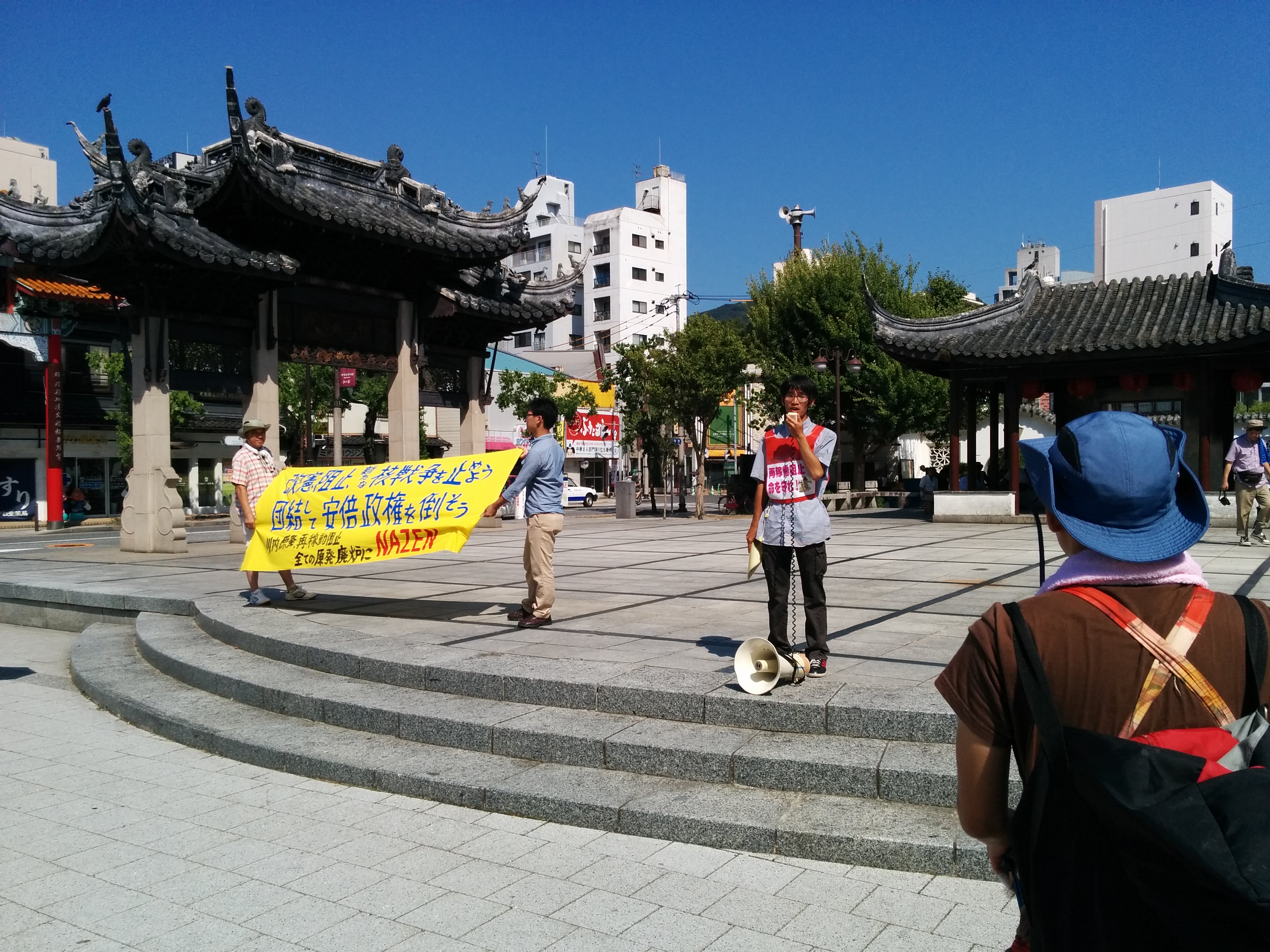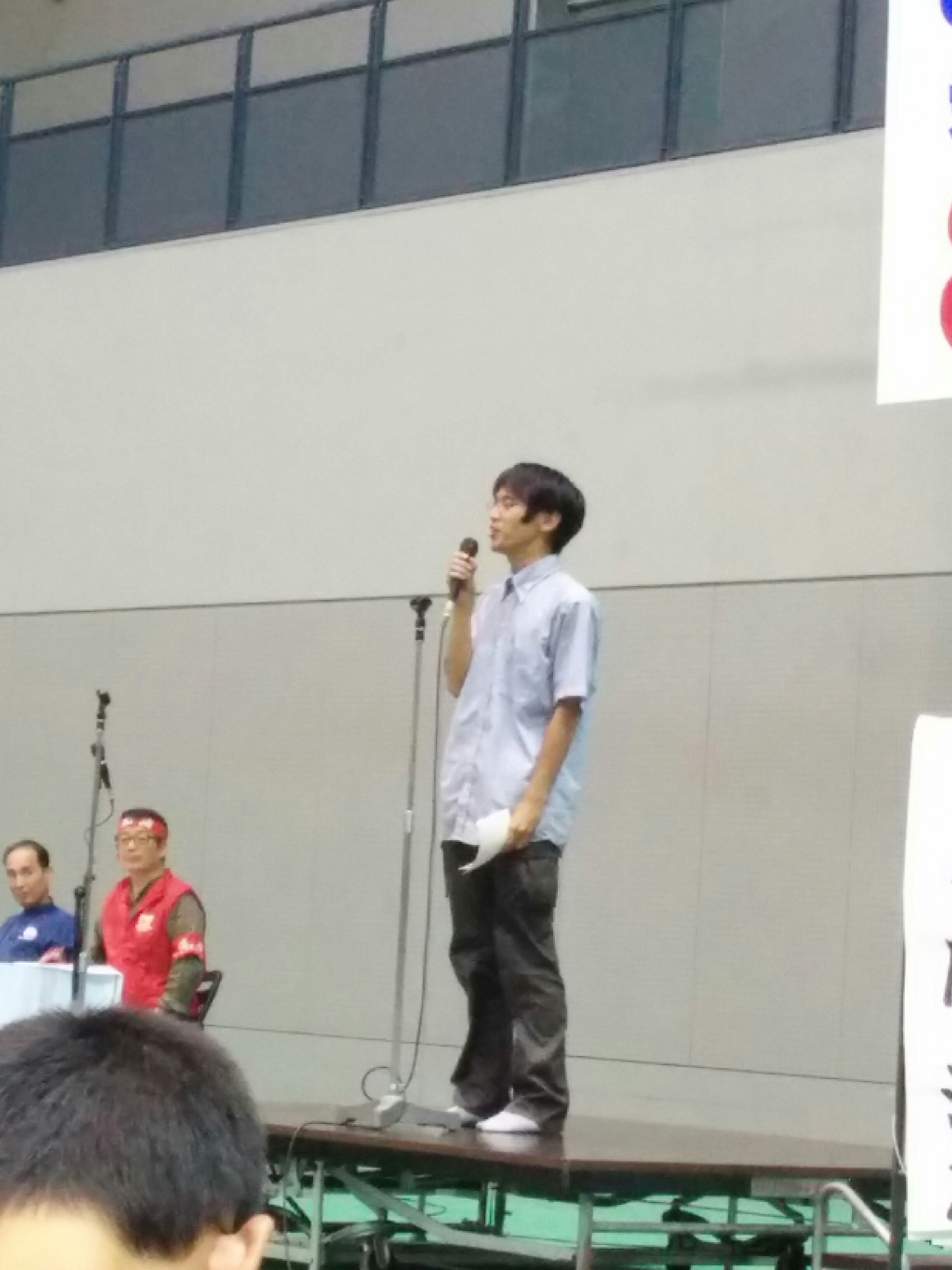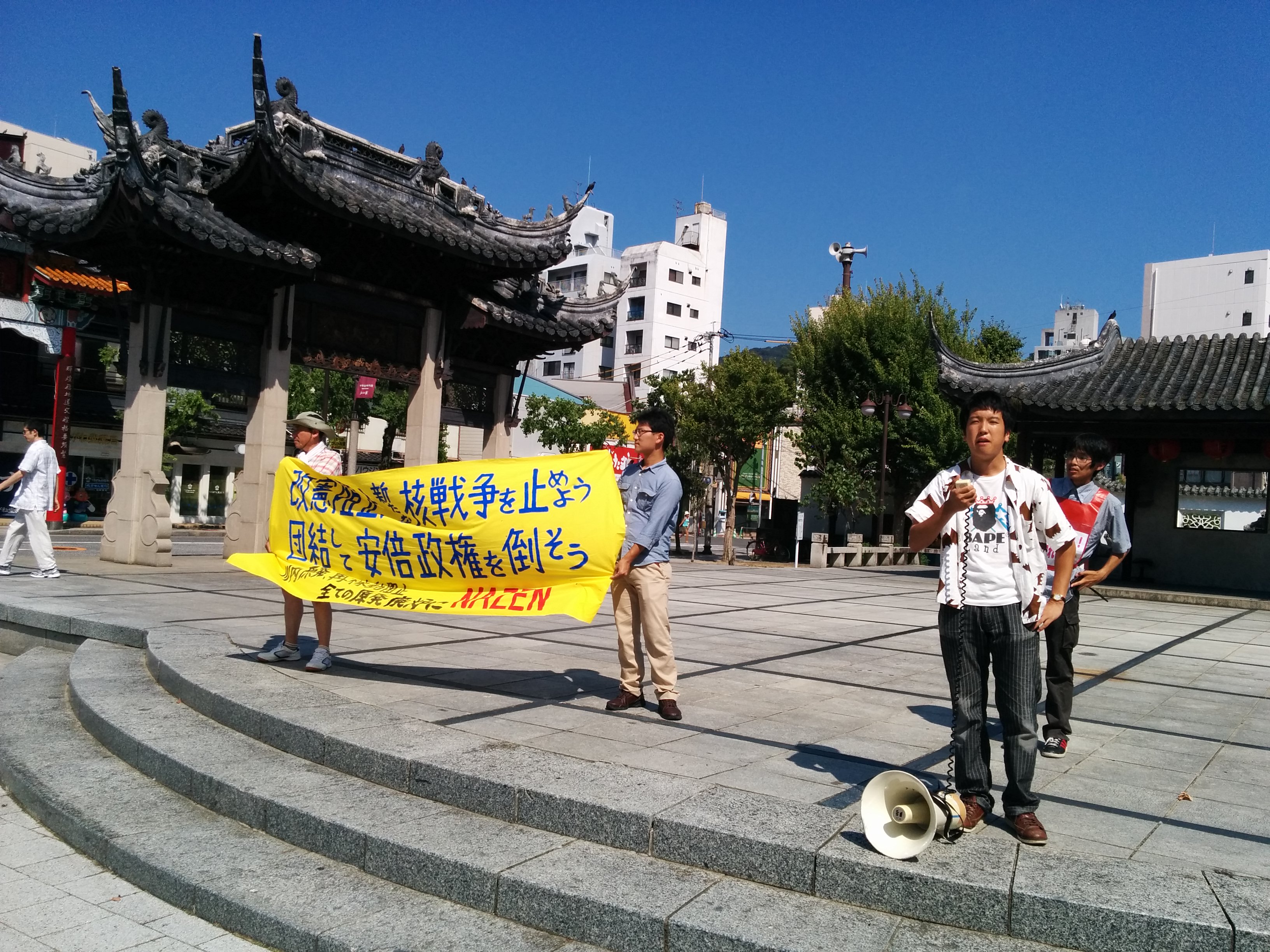 広島大学学生自治会は、7月2日昼休み、スペイン広場にて「7・2広大キャンパス集会」を大成功で打ち抜き、「広大を反戦のとりで」にする決定的一歩を踏み出しました! まずはじめに学生自治会の森田寛隆君が、「安倍政権は打倒寸前だ! 生き方をかけて立ち上がる人々の力が、次の社会のあり方を決定する。広大生は今こそ立ち上がろう!」から始まる基調提起を、約1000人の学生に向け、堂々と行いました。基調では、“戦後レジームからの脱却”を掲げ、戦争国家化を強行する安倍に対し、“平和“”民主主義”のタテマエとは裏腹に、数々の戦争に加担し、労働者、学生の権利を奪ってきた「戦後体制」の欺瞞を暴き、同時に、一切が労働組合・学生自治会の解体攻撃と して進んできた歴史を総括。「憲法に象徴された戦後体制そのものを乗り越え、根本から社会を変えよう!」と闘いの路線を提起しました。さらに、安倍との対決に向け「学生がひとつに団結して闘う組織」=学生自治会を甦らせてきた広大学生運動の決定的意義と、安保国会の渦中から、「政治を語り、未来を語る場。真の学問の場」として、大学キャンパスを取り戻しつつある今日までの到達地平を積極的に明らかにし、「今日の集会から、更に一歩踏みだそう!」と7・5ー8・6への決起を呼びかけました。