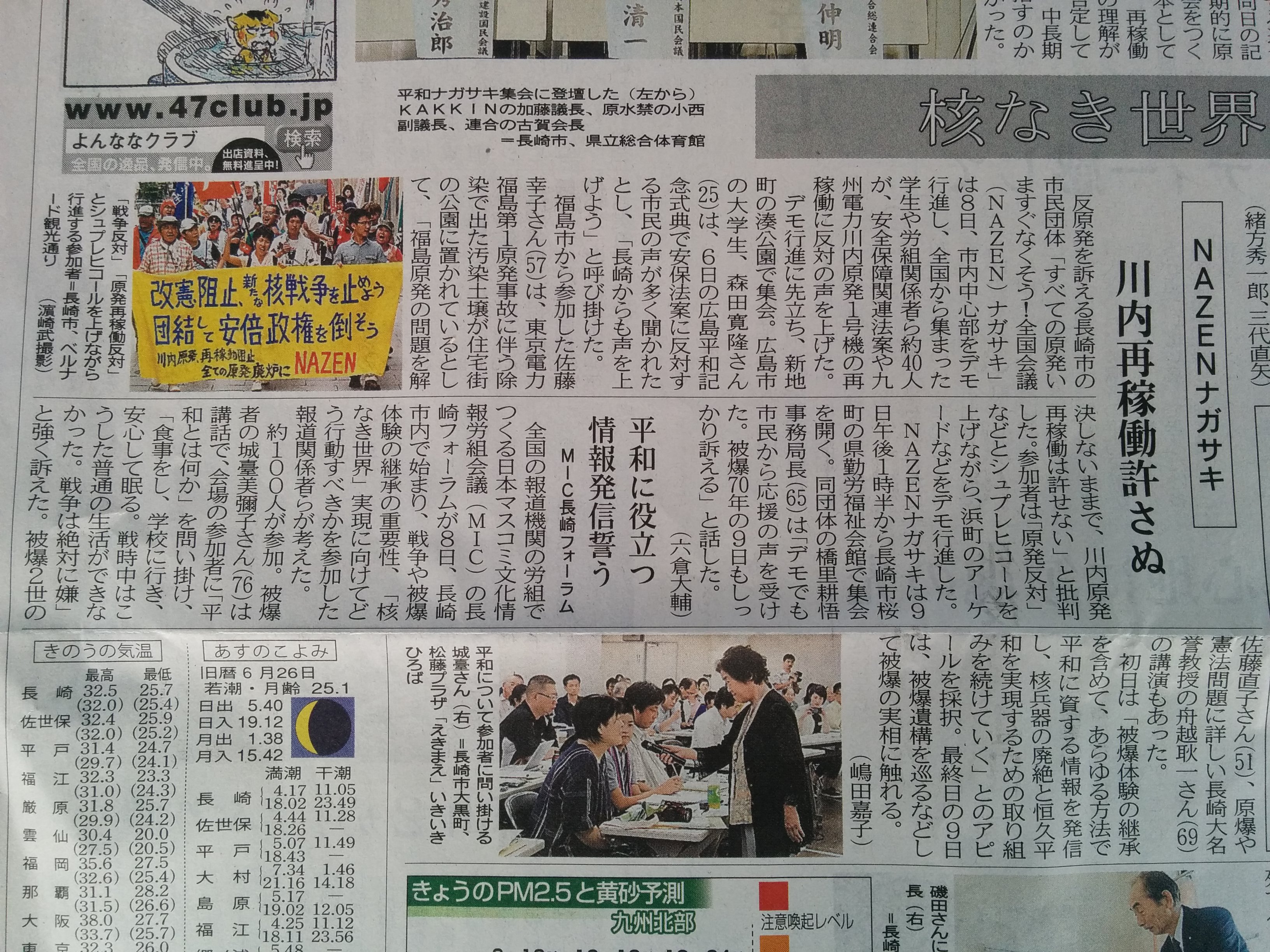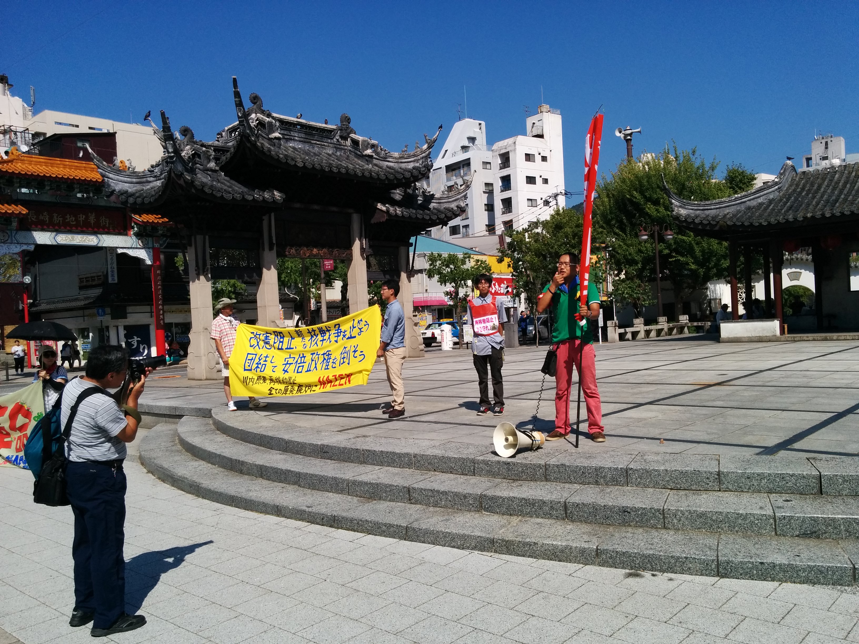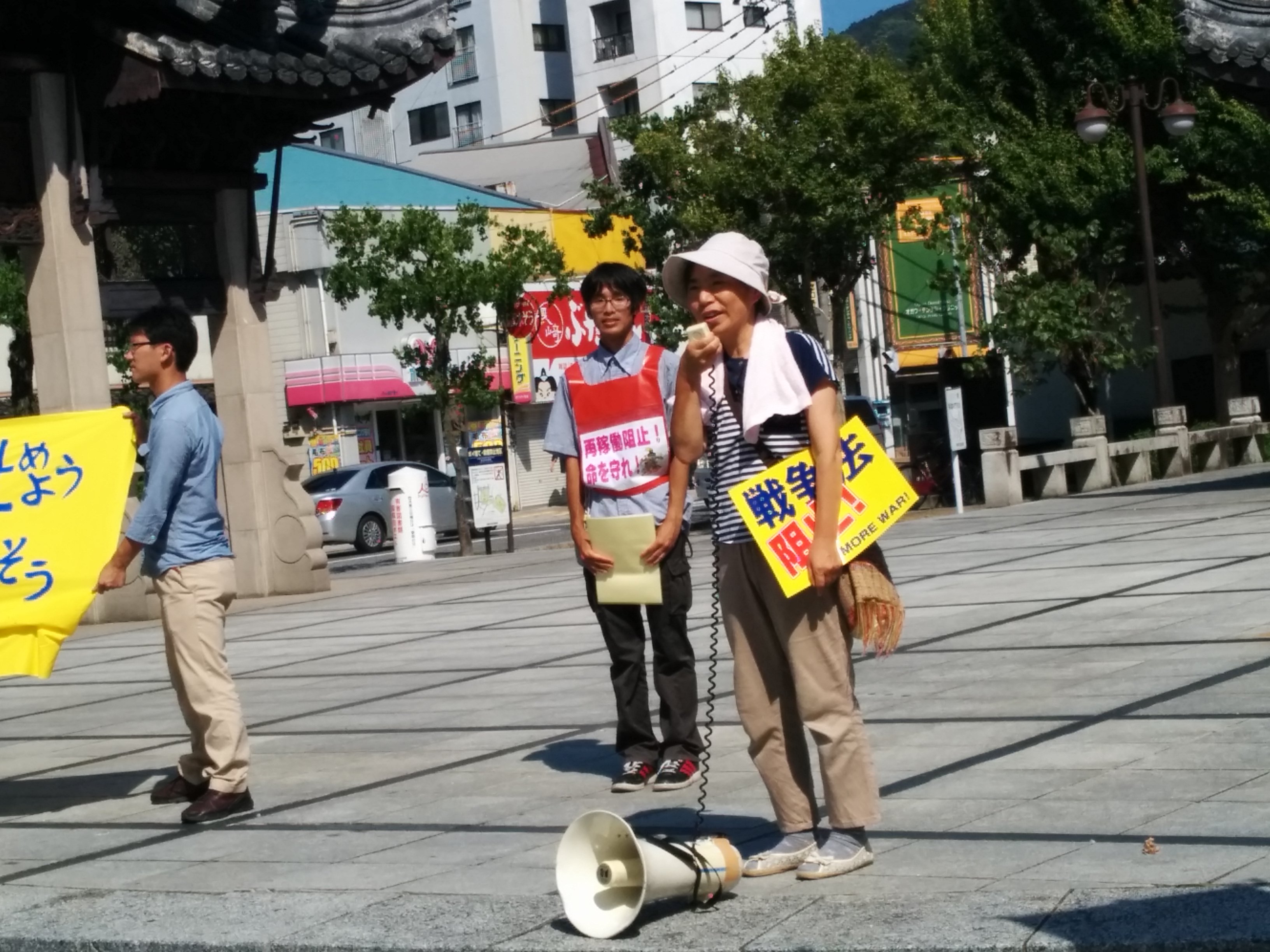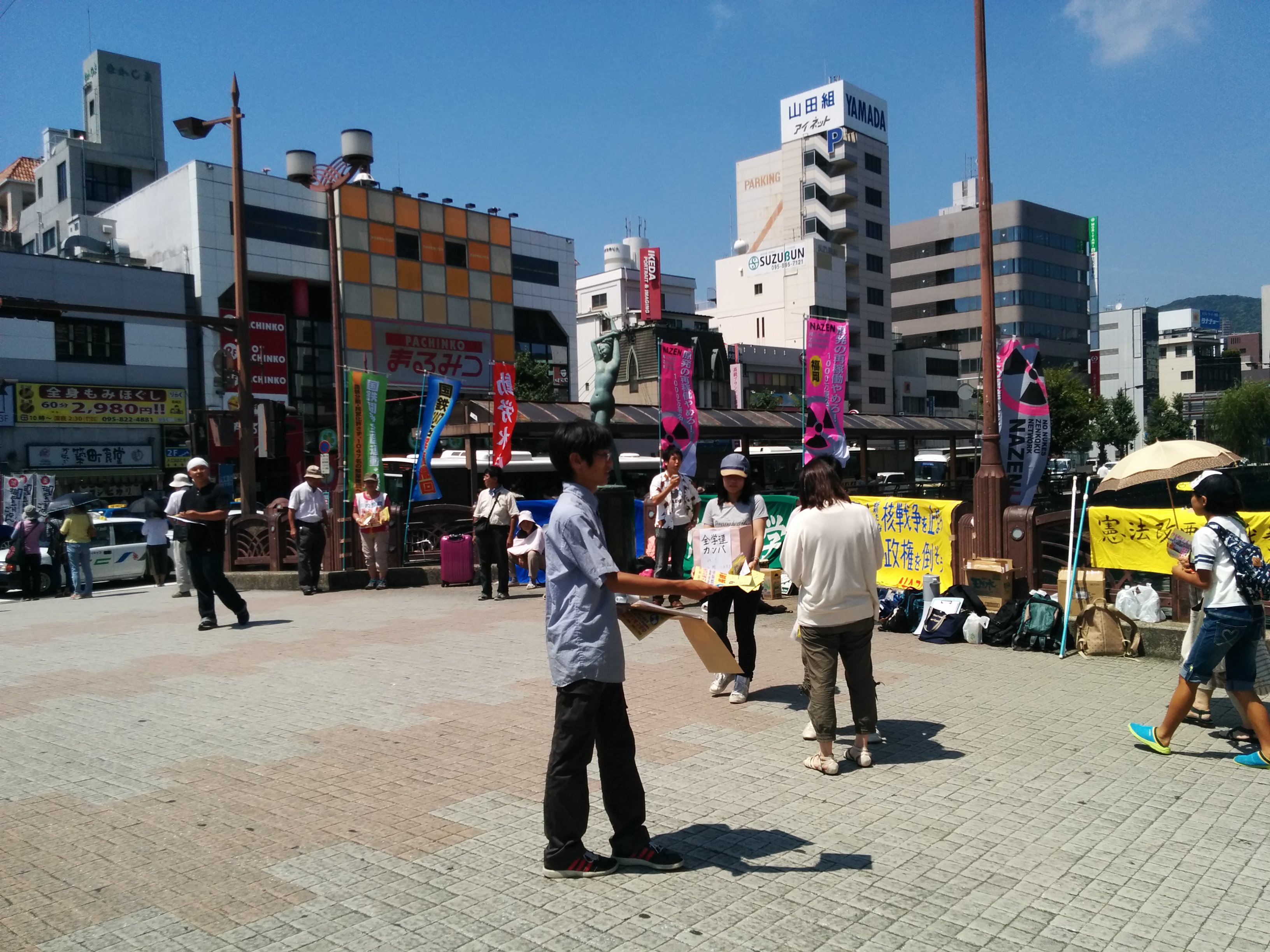 広島大学学生自治会は、7月2日昼休み、スペイン広場にて「7・2広大キャンパス集会」を大成功で打ち抜き、「広大を反戦のとりで」にする決定的一歩を踏み出しました! まずはじめに学生自治会の森田寛隆君が、「安倍政権は打倒寸前だ! 生き方をかけて立ち上がる人々の力が、次の社会のあり方を決定する。広大生は今こそ立ち上がろう!」から始まる基調提起を、約1000人の学生に向け、堂々と行いました。基調では、“戦後レジームからの脱却”を掲げ、戦争国家化を強行する安倍に対し、“平和“”民主主義”のタテマエとは裏腹に、数々の戦争に加担し、労働者、学生の権利を奪ってきた「戦後体制」の欺瞞を暴き、同時に、一切が労働組合・学生自治会の解体攻撃と して進んできた歴史を総括。「憲法に象徴された戦後体制そのものを乗り越え、根本から社会を変えよう!」と闘いの路線を提起しました。さらに、安倍との対決に向け「学生がひとつに団結して闘う組織」=学生自治会を甦らせてきた広大学生運動の決定的意義と、安保国会の渦中から、「政治を語り、未来を語る場。真の学問の場」として、大学キャンパスを取り戻しつつある今日までの到達地平を積極的に明らかにし、「今日の集会から、更に一歩踏みだそう!」と7・5ー8・6への決起を呼びかけました。