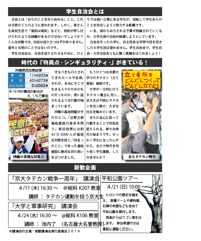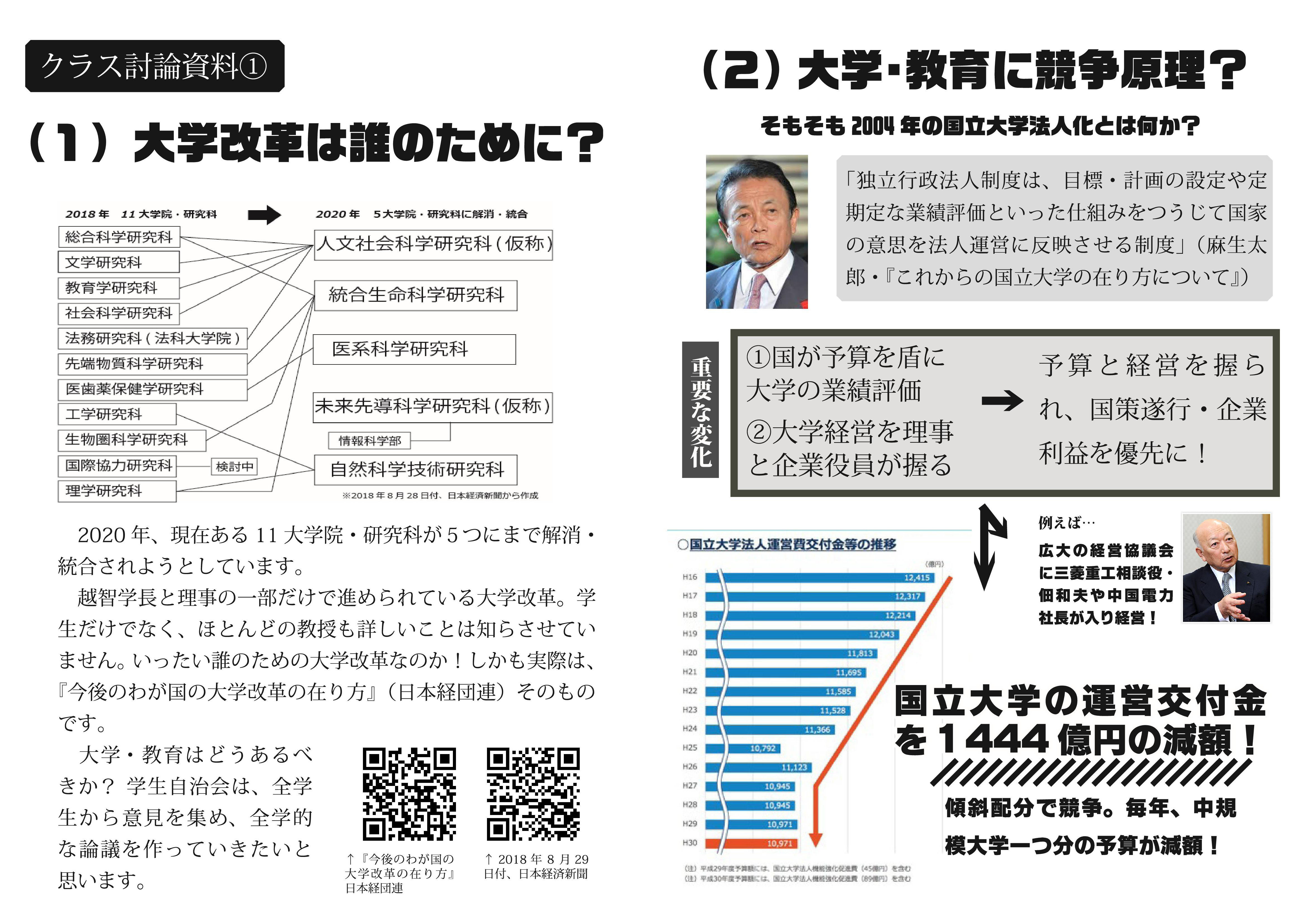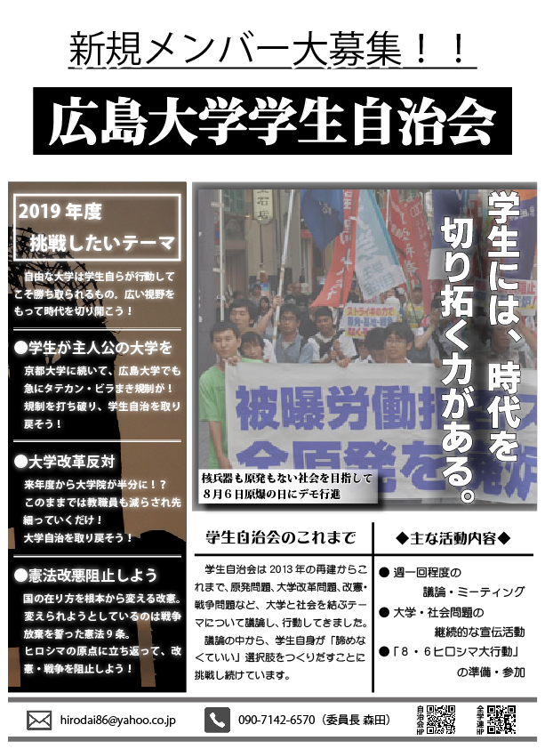 学生自治会としてやりたいこと! 学内テーマ編! 6月17日発行のビラです。 「学生自治会と大学職員がもめているのは知っているが、学生自治会が何をやりたいのかわからない」という意見が様々な広大生から寄せられていたため、そうした意見に応えたいと思い、作成したビラです。 PR