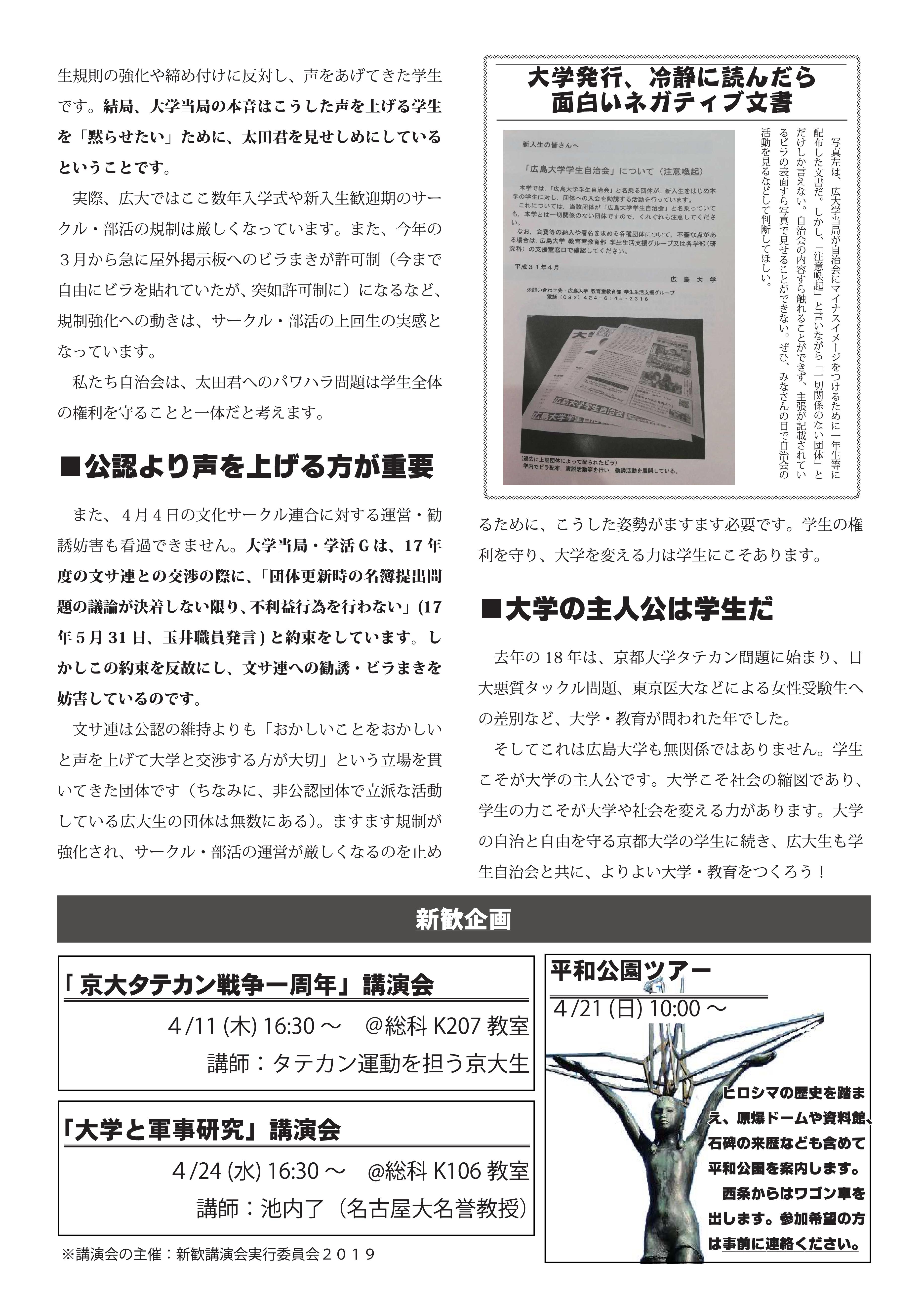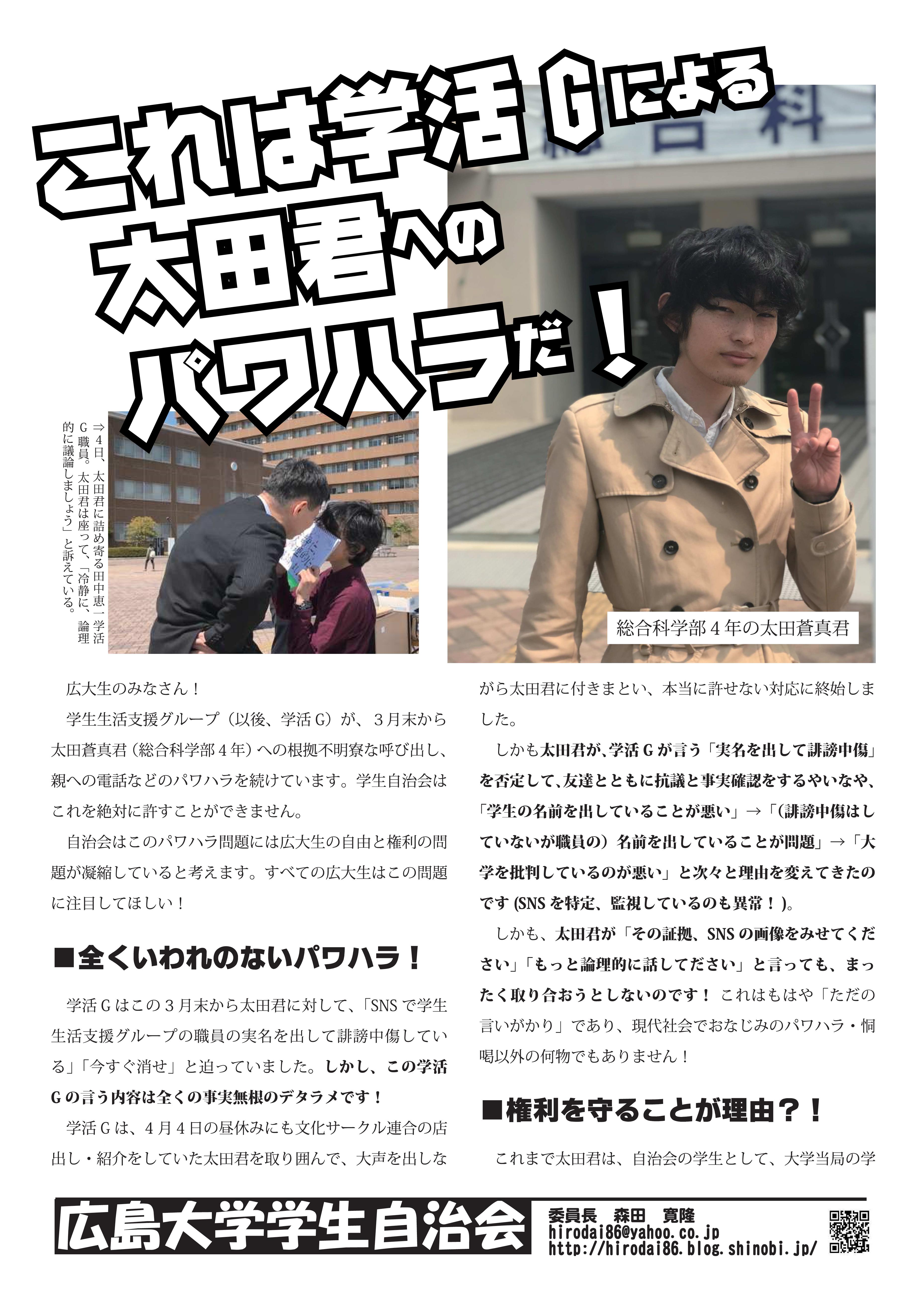 「小銃で撃たれなかっただけマシ」!? 懲りない職員の暴言! 6月11日発行のビラです。 片岡職員(総務・リスク担当)は6月4日、太田くん(総科4年)へのパワハラ問題、先日の傷害罪でっち上げ逮捕の謝罪を求めても回答せず、6・4天安門事件を引き合いに出し、「小銃で撃たれんかっただけでもマシ」「戦車に轢かれんかっただけでもマシ」などと言い放ちました。 6月11日昼休みに片岡職員は上記発言を認めたうえで、この発言の意図について、「日本は警察が(学生運動やっても)小銃で撃ったりしてこないような平和国家である、ということが言いたかった」という旨の説明をしました。 しかし、これまで行われてきた太田くんへのパワハラ問題や、先日の傷害事件のでっち上げ問題に対する回答に全くなっておらず、むしろ最悪の弾圧事件を引き合いに出して、田中恵一学生生活支援グループリーダーらによるパワハラ・事件でっち上げを正当化する趣旨にしかとれません。 このような理不尽な対応を行っているのは、広島大学の中でもごく一部の職員だけです。私たちは、田中職員や片岡職員のような弾圧職員をけしかけてきた、その本当の責任者を出すよう求めます。その責任者は、広大生全体の在り方を学活Gなどを経由して様々な形で規制し、ゆがめてきた者に違いありません。 学生対応の責任者を学生全体の力で引きずり出し、広大が今どうなっていて、彼らが学生をどうしていこうとしているのか、すべてを明らかにさせよう!