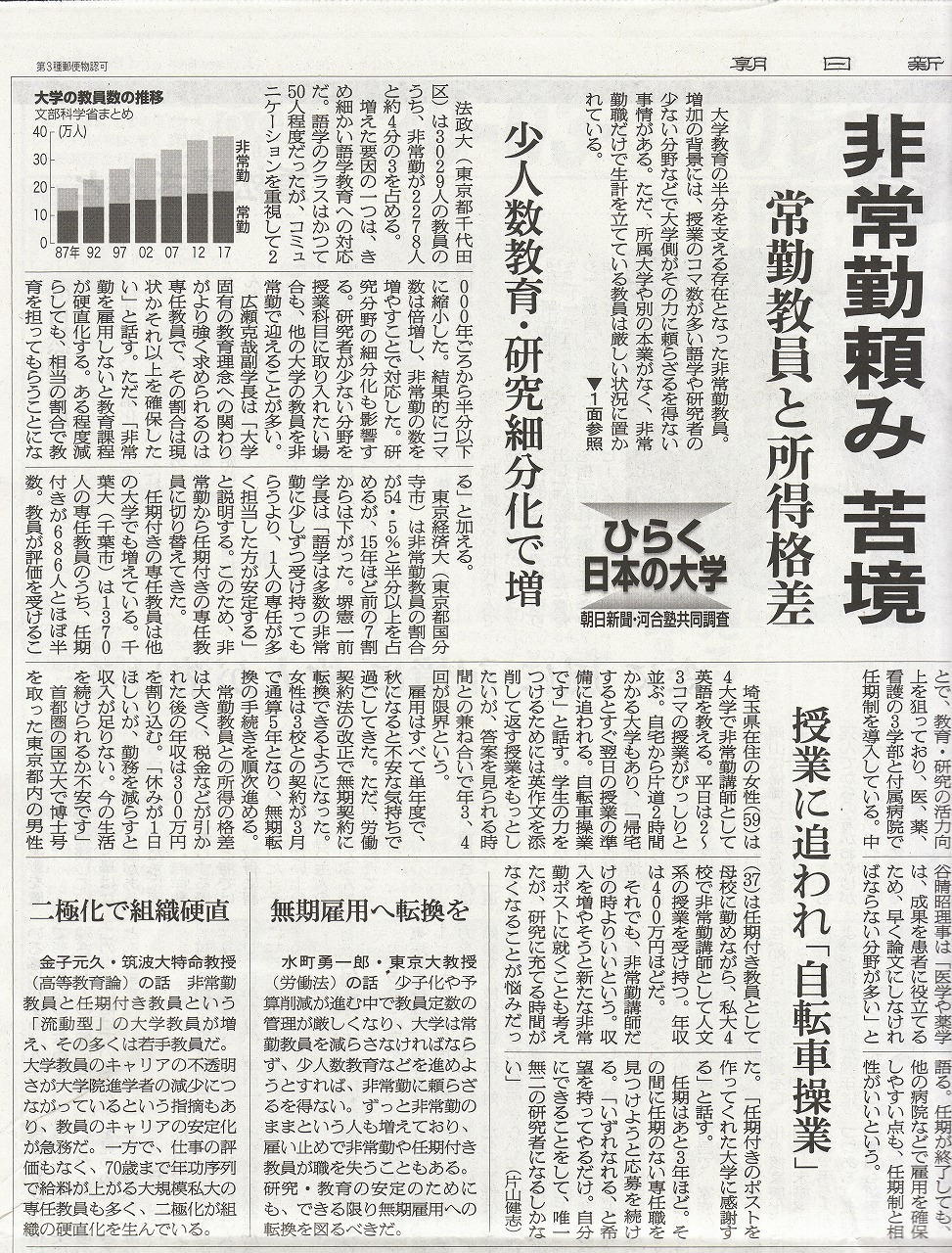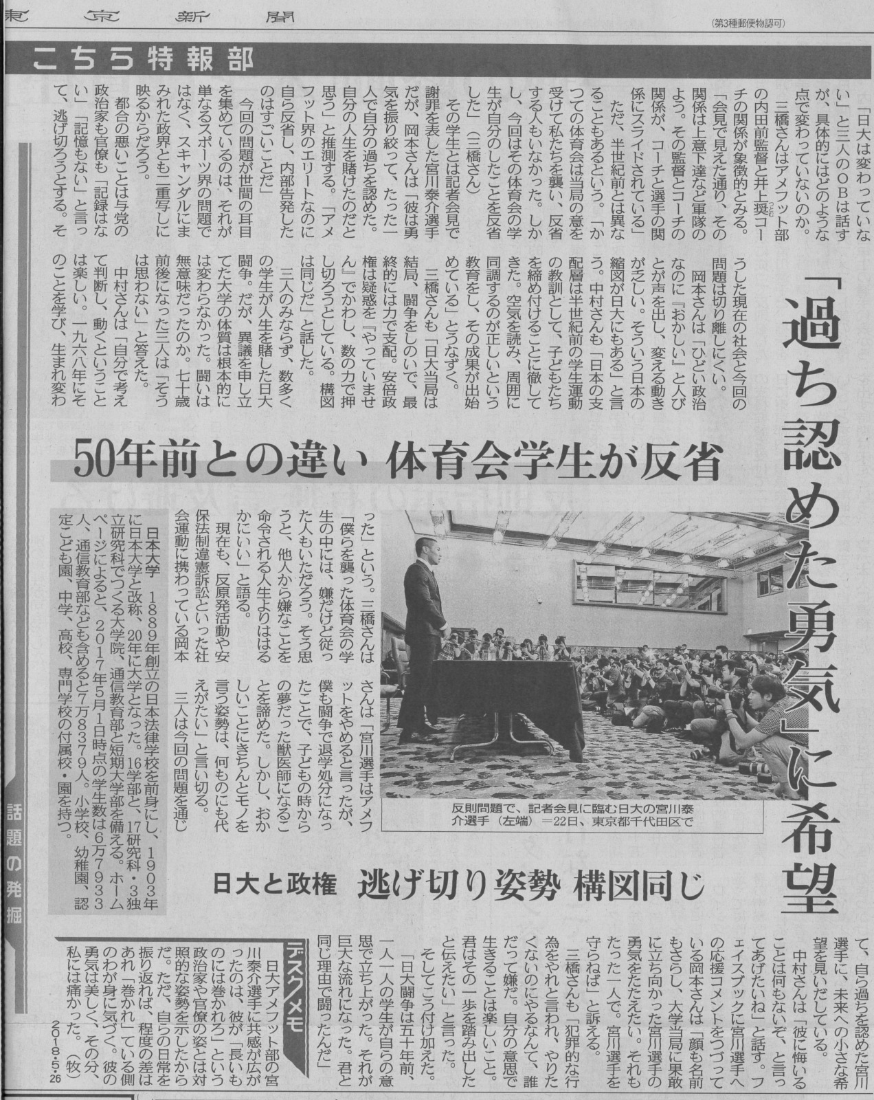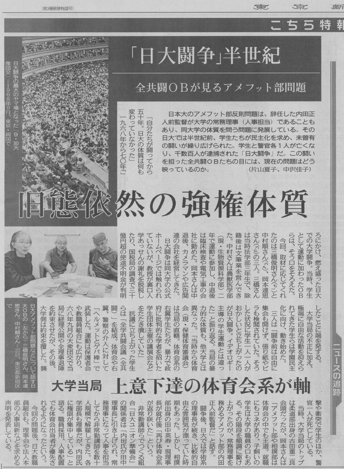 日大闘争から半世紀 5月26日付、東京新聞より。 大学は50年前と同じ、腐敗にまみれた状態に戻りました。逆に言えば、これまでの「真理を追究する大学」のイメージは、学生たちが腐敗する大学を追及し、「おかしいことにおかしい」と団結して声を上げることによってつくられたということです。 広島大学も日大当局と同じく腐敗しています。「キャンパスで飛び降り自殺があっても隠蔽」「有名教授による学生暴行事件が明るみになっても全力で責任回避」、こうしたことを追及しても「関係ない」という回答であり、大学当局には一切展望はありません。学生の死にさえまともに向き合えないくせに、「学生を守る」などと連呼している大学職員がいる限り、学生が実際に守られることなどないでしょう。責任を回避したいがために使われている言葉が「学生を守る」となっているだけですから。 大学当局の無責任なあり方と対決し、学生・教職員の団結を取り戻す中にのみ展望はあります。