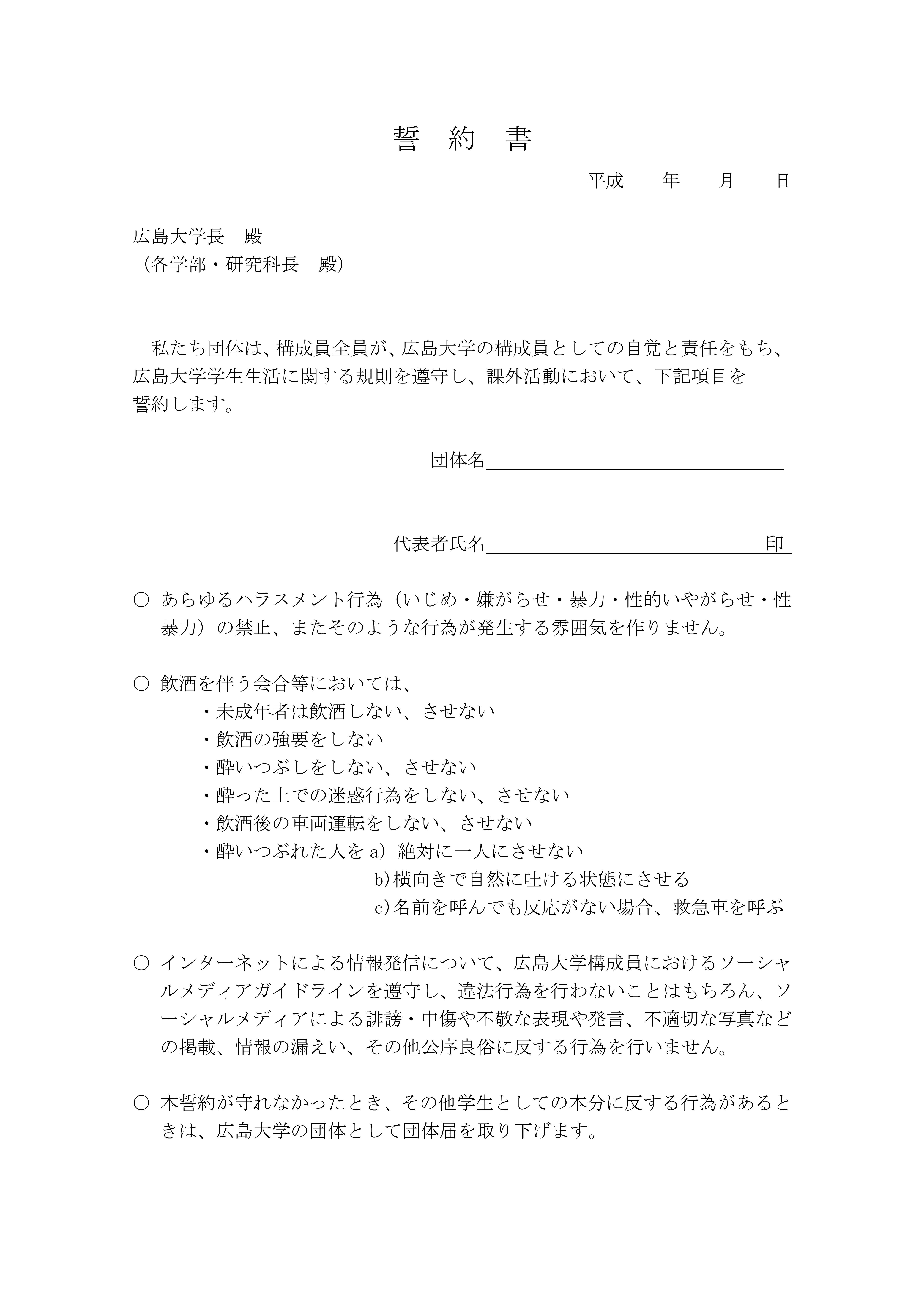 違反したらサークル・部活解散を誓約させる広島大学! 今年から突如、学生団体に対して「誓約書」なるものが登場しました。しかも、ほとんどのサークル員に説明もなければ、知らされていもいません!ナンセンス! しかも、誓約に違反すれば、自ら学生団体、サークル・部活を解散するという「誓約書」です。こんなものは、学生自治、サークル自治破壊のなにものでもありません。学生は反対の声を上げよう!