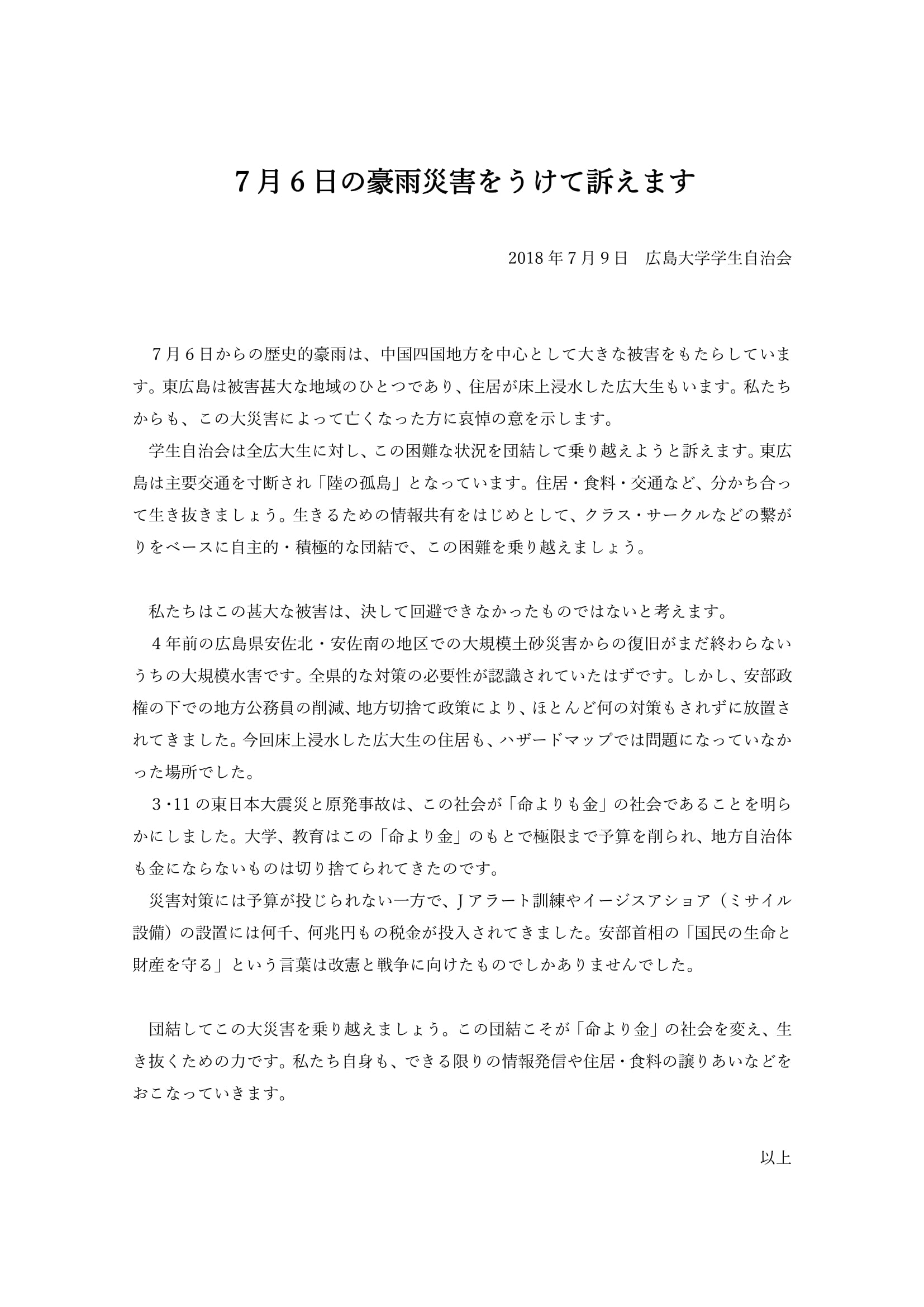 7月6日の豪雨災害をうけて訴えます 7月6日の豪雨災害をうけて訴えます2018年7月9日 広島大学学生自治会 7月6日からの歴史的豪雨は、中国四国地方を中心として大きな被害をもたらしています。東広島は被害甚大な地域のひとつであり、住居が床上浸水した広大生もいます。私たちからも、この大災害によって亡くなった方に哀悼の意を示します。 学生自治会は全広大生に対し、この困難な状況を団結して乗り越えようと訴えます。東広島は主要交通を寸断され「陸の孤島」となっています。住居・食料・交通など、分かち合って生き抜きましょう。生きるための情報共有をはじめとして、クラス・サークルなどの繋がりをベースに自主的・積極的な団結で、この困難を乗り越えましょう。 私たちはこの甚大な被害は、決して回避できなかったものではないと考えます。 4年前の広島県安佐北・安佐南の地区での大規模土砂災害からの復旧がまだ終わらないうちの大規模水害です。全県的な対策の必要性が認識されていたはずです。しかし、安部政権の下での地方公務員の削減、地方切捨て政策により、ほとんど何の対策もされずに放置されてきました。今回床上浸水した広大生の住居も、ハザードマップでは問題になっていなかった場所でした。 3・11の東日本大震災と原発事故は、この社会が「命よりも金」の社会であることを明らかにしました。大学、教育はこの「命より金」のもとで極限まで予算を削られ、地方自治体も金にならないものは切り捨てられてきたのです。 災害対策には予算が投じられない一方で、Jアラート訓練やイージスアショア(ミサイル設備)の設置には何千、何兆円もの税金が投入されてきました。安部首相の「国民の生命と財産を守る」という言葉は改憲と戦争に向けたものでしかありませんでした。 団結してこの大災害を乗り越えましょう。この団結こそが「命より金」の社会を変え、生き抜くための力です。私たち自身も、できる限りの情報発信や住居・食料の譲りあいなどをおこなっていきます。以上 PR