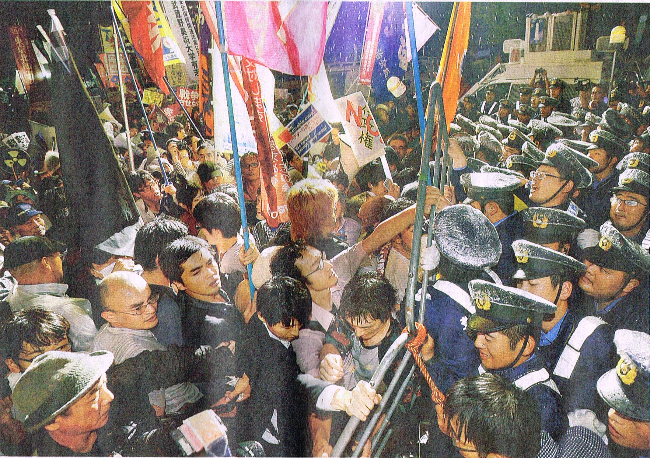 9/16深夜の国会正門前。鉄柵と機動隊でまるで「戒厳令下」にしいた安倍政権に対し、デモ参加者が抗議に立ち上がった。このとき13名が「公務執行妨害」で不当逮捕。