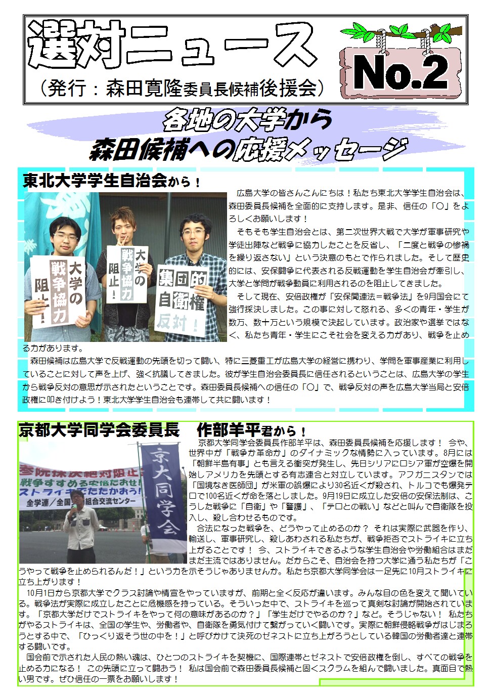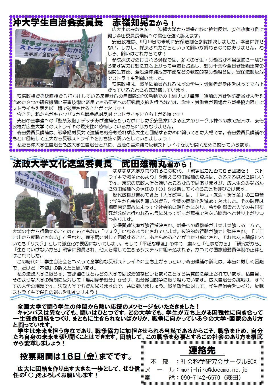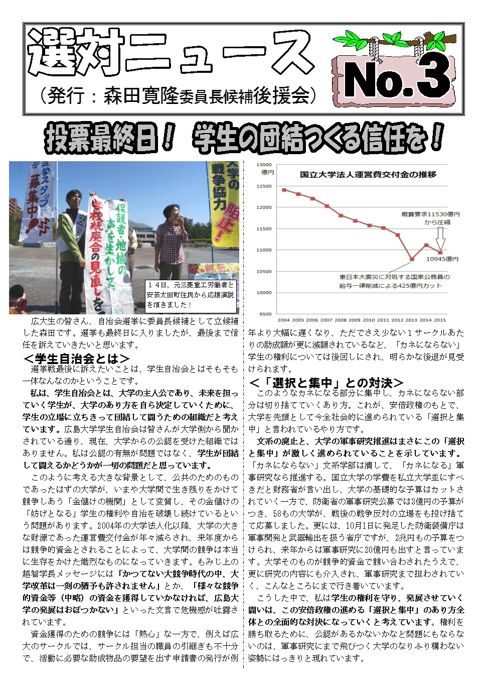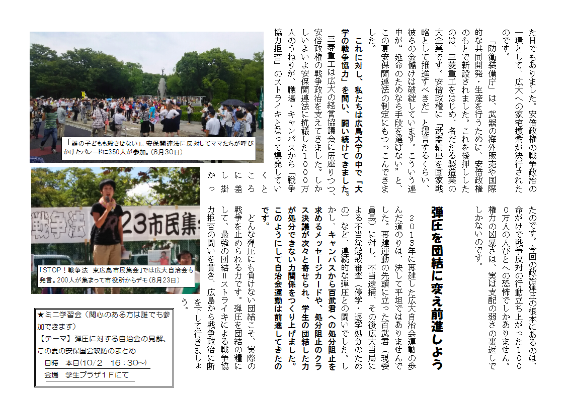 安倍政権が採決を強行した安保関連法。私たち広島大学学生自治会も多くの人びとともに全力で反対の声を上げ続けました。行く先々で、話しかけていただき、「学生頑張ってくれ」と激励もしていただきました。