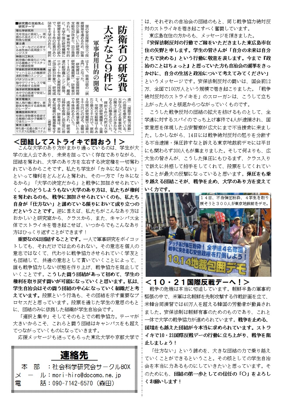 とりわけ全港湾や関西生コンといった先駆的な労働組合は、9月から安保関連法に反対する反戦ストライキ、政治ストライキに立ち上がり始めています。こうした闘いに続いていこう。