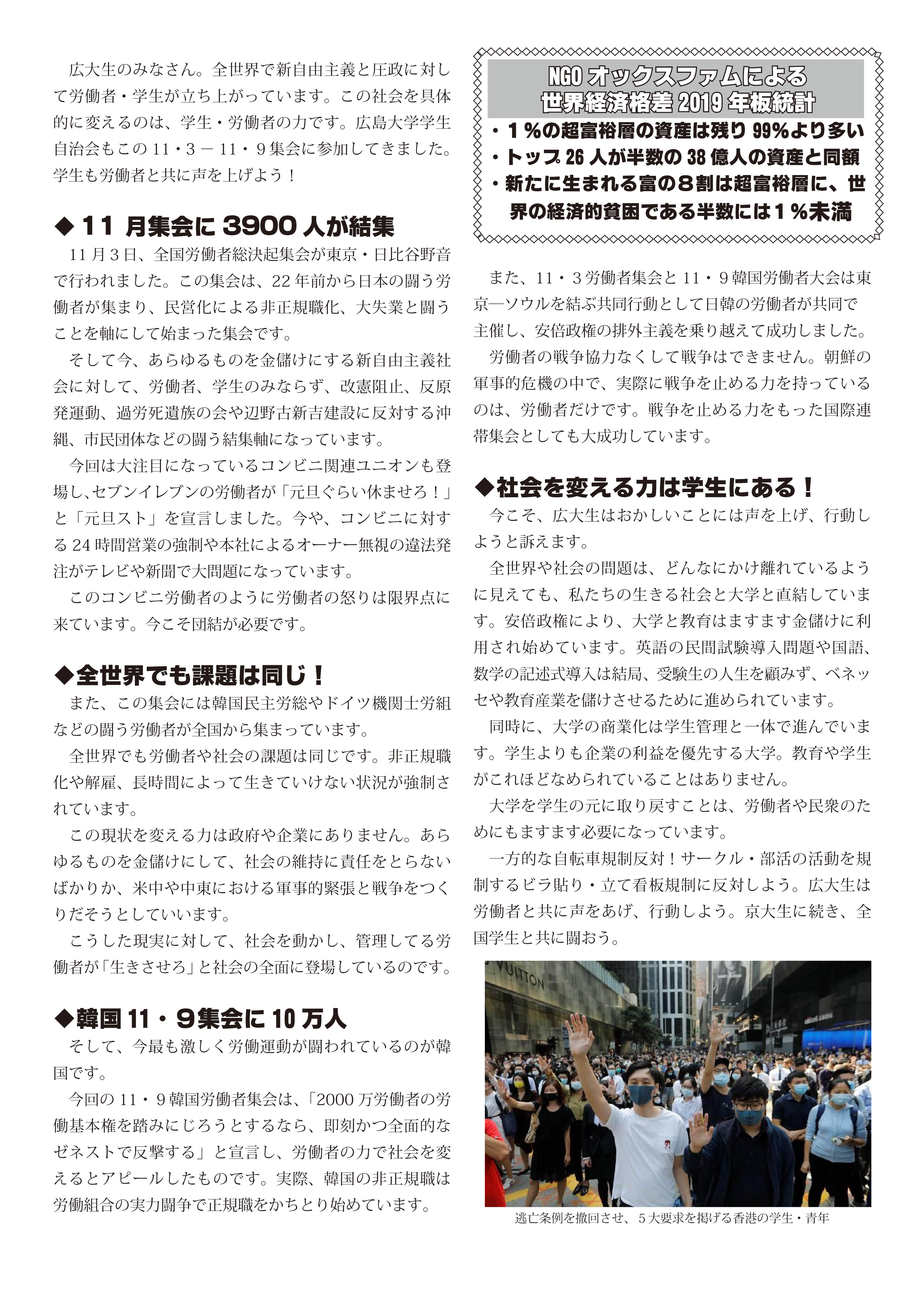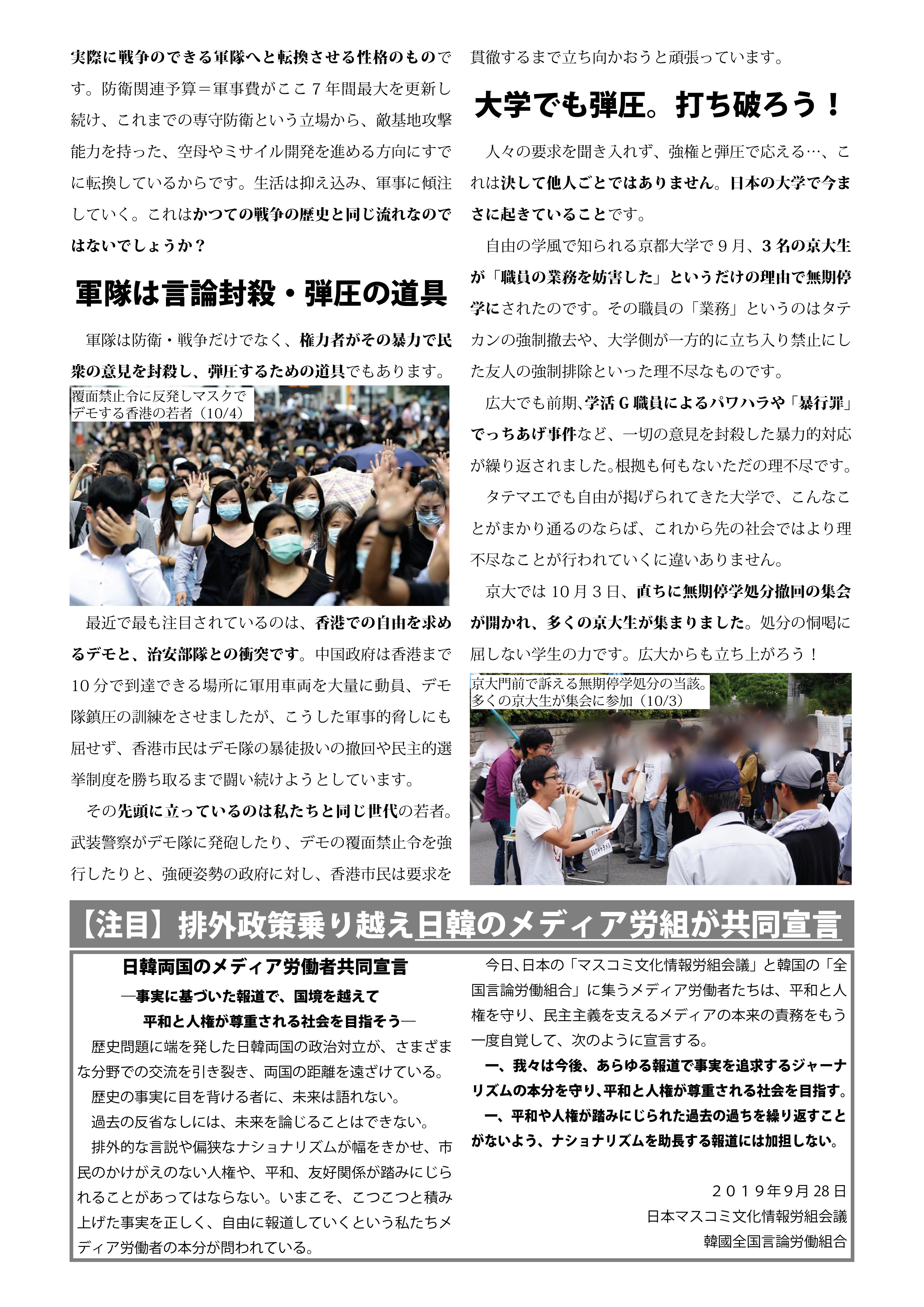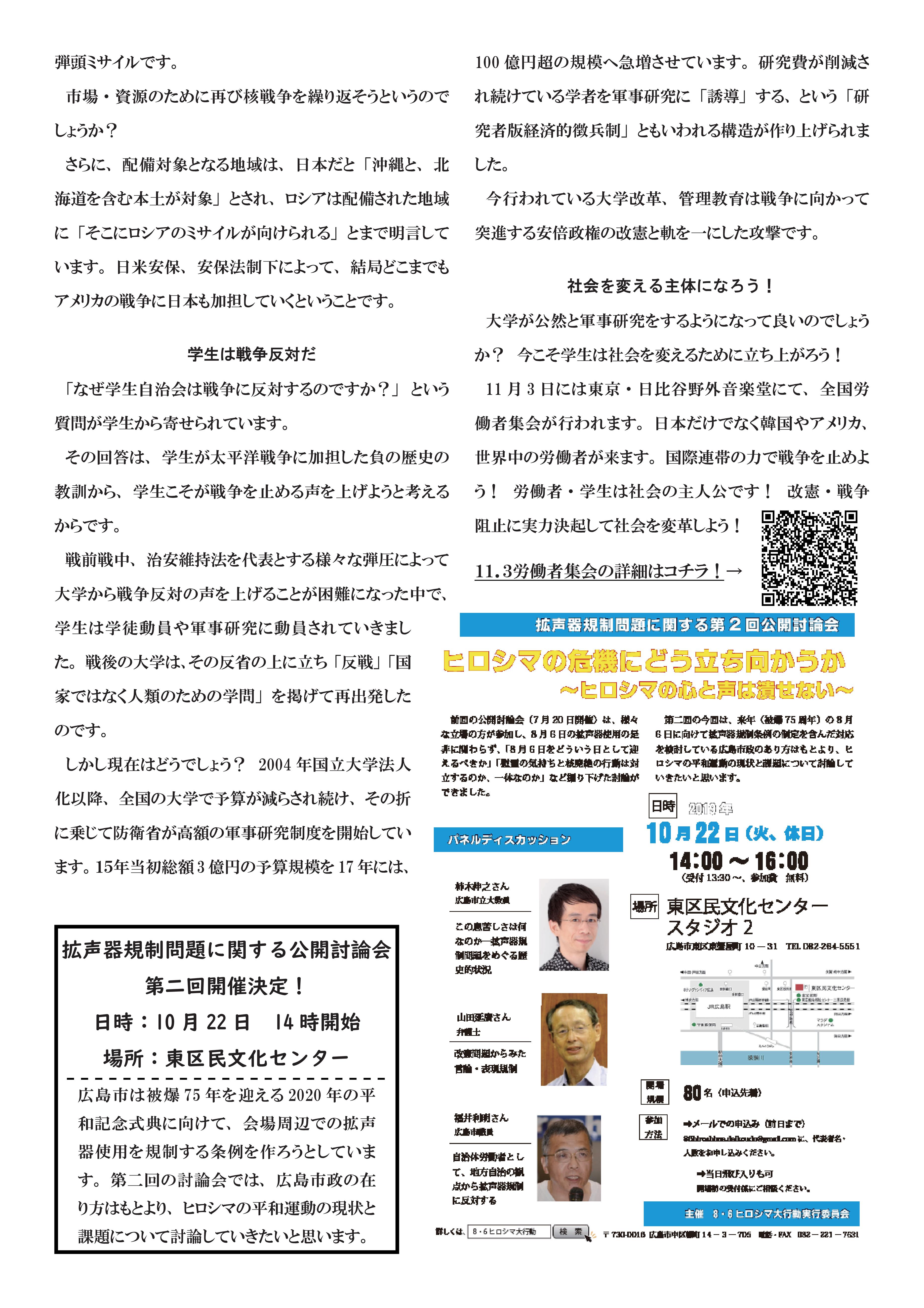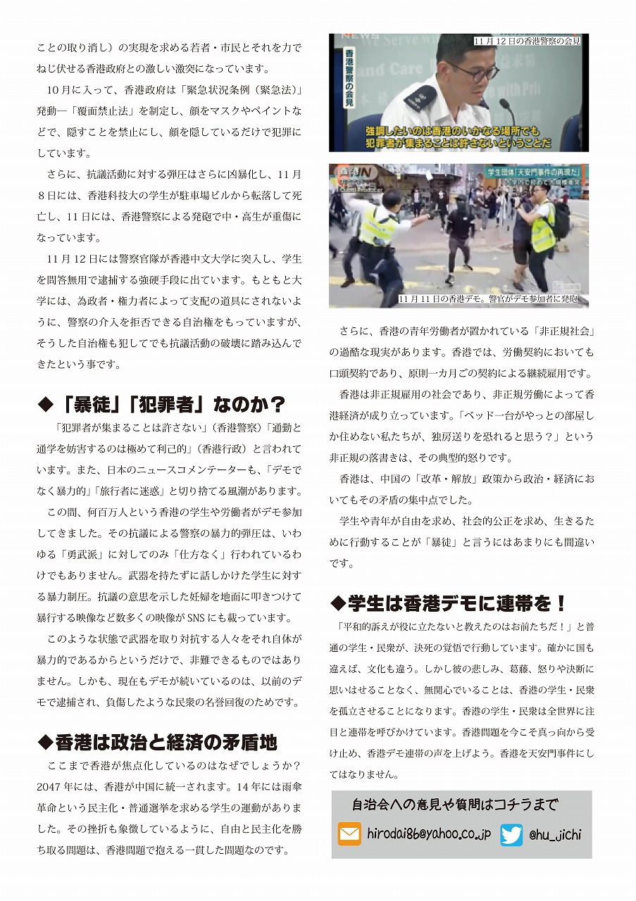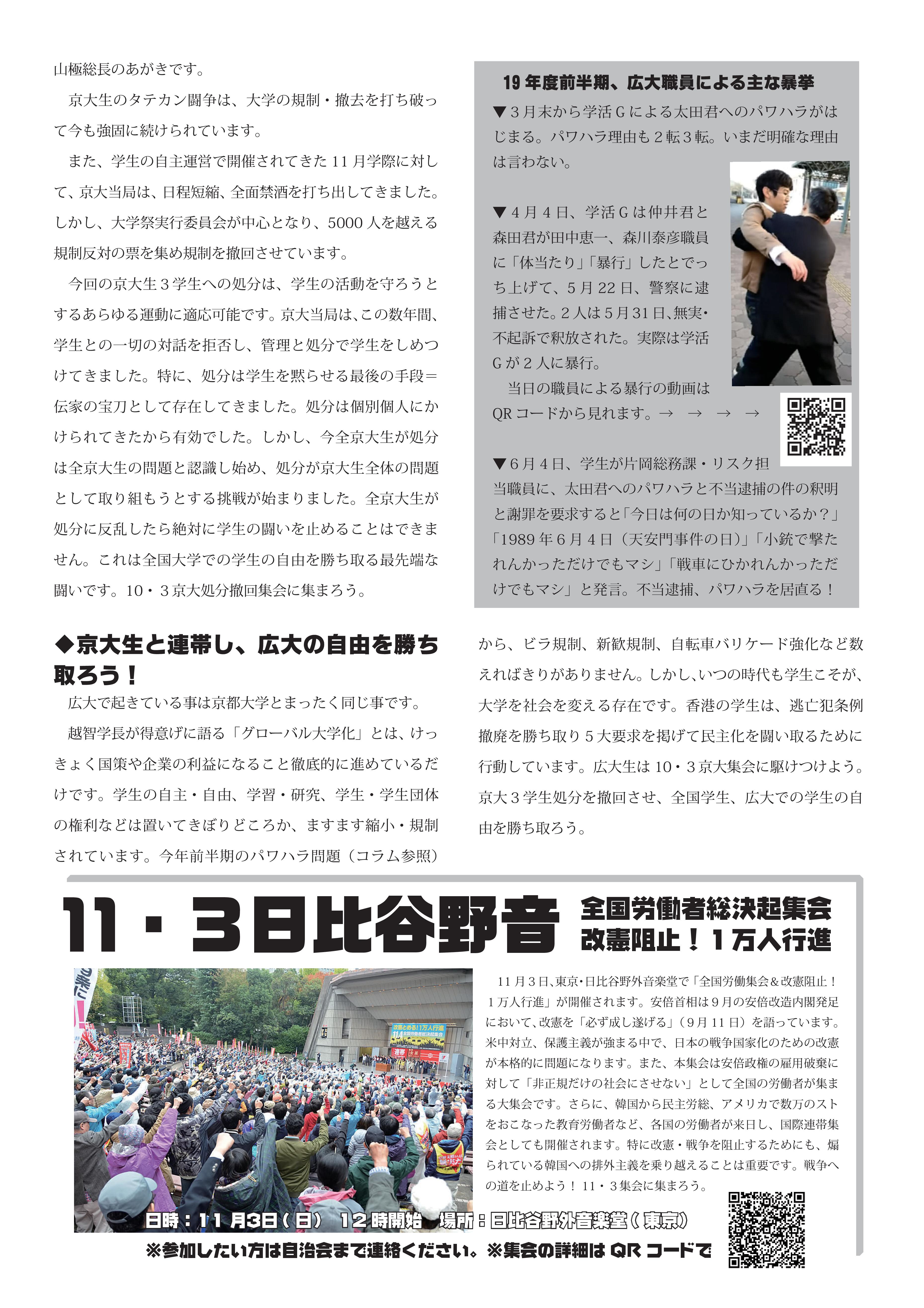 情報開示請求の回答が! 自治会関係の法人文書なし!? 7月9日発行のビラです。 大学が保有している法人文書(大学組織としての意思決定に関して作成・取得された、電子データも含む「文書」のこと)を開示させる情報開示請求。 学生自治会に関する情報開示請求を行ったところ、この3年間、入学式で配布された学生自治会への誹謗中傷ビラだけが法人文書として開示され、他に関係するものはない、という回答。 そうするとまずもって、学生自治会を誹謗中傷した上記ビラの作成や、そのビラを入学式で配布することを決定した過程等に関わる事柄について、法人文書はない=大学の意思決定に文書が介在していない、ということになります。おおよそ考え難く、本当にそうだとしたら、そうとうにずさんな体制で、毎年学生自治会を入学式から名指しで誹謗中傷してきたことになります。 それに今年行われてきた、パワハラとしか受け止められない、学生生活支援グループの連日の学生自治会に対する執拗な攻撃についても、法人文書(メールなども!?)がなかったということから、組織決定として行われてきたのか、職員個々人のハラスメントだったのかも不明瞭ということになってしまいます。 学生生活支援グループリーダーの田中恵一職員(自分から転んで傷害罪をでっち上げ、学生自治会メンバーを警察に売り渡した人物)は、かつて法人文書について学内で講演を行っており(2016年「あなたにとって文書とはなんですか」 http://ir.lib.hiroshima-u.ac.jp/ja/list/HU_journals/AA12030682/--/19/item/42989)、学生自治会への対応についてであろうが、文書管理がなされていなかったなどありえない、優秀な文書管理のスペシャリストだったはずです。にもかかわらず、学生自治会についてのまともな法人文書が一切ない。だとすると広島大学では、昨年あたりから国政の大問題として取り上げられるようになってきた「公文書隠し」が、巧妙に行われてきたということになるでしょうか? そうでないなら、これまでの学生自治会への対応の一切は、書類もきちんと作成しないで、恣意的に広島大学の名をかたって行われてきた、ということになるかもしれません。 まだまだ情報開示請求の文言が甘かった可能性もあるので、私たちとしては、引き続き様々な学内情報について、情報開示請求を続けていきたいと思っています。